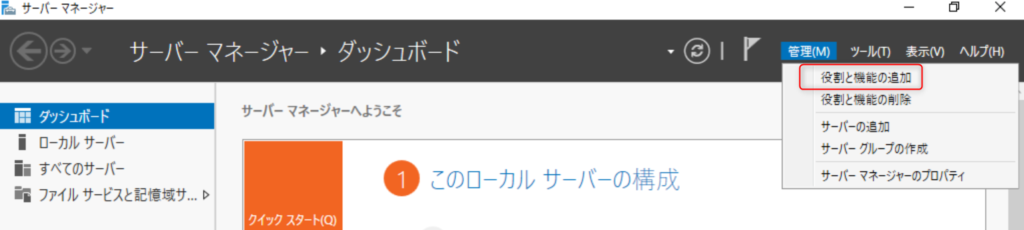 Windows Server 2022を起動し、ログインするとサーバーマネージャーが起動するので、管理をクリックし「役割と機能の追加」をクリック
