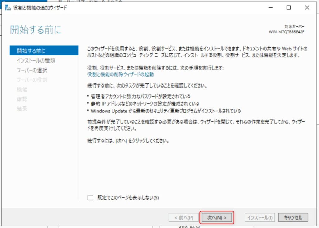 役割と機能の追加ウィザードが表示され、開始する前には何もせずに「次へ」をクリック
