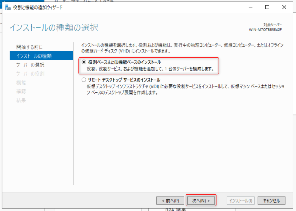 インストールの種類の選択では、「役割ベースまたは機能ベースのインストール」を選択し「次へ」をクリック