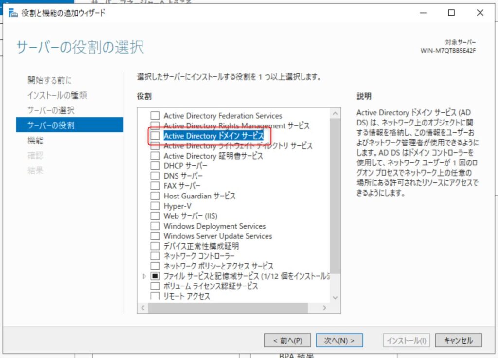 サーバの役割の選択に戻って来るので、「Active Directory ドメイン サービス」にチェックが入ったことを確認して「次へ」をクリック