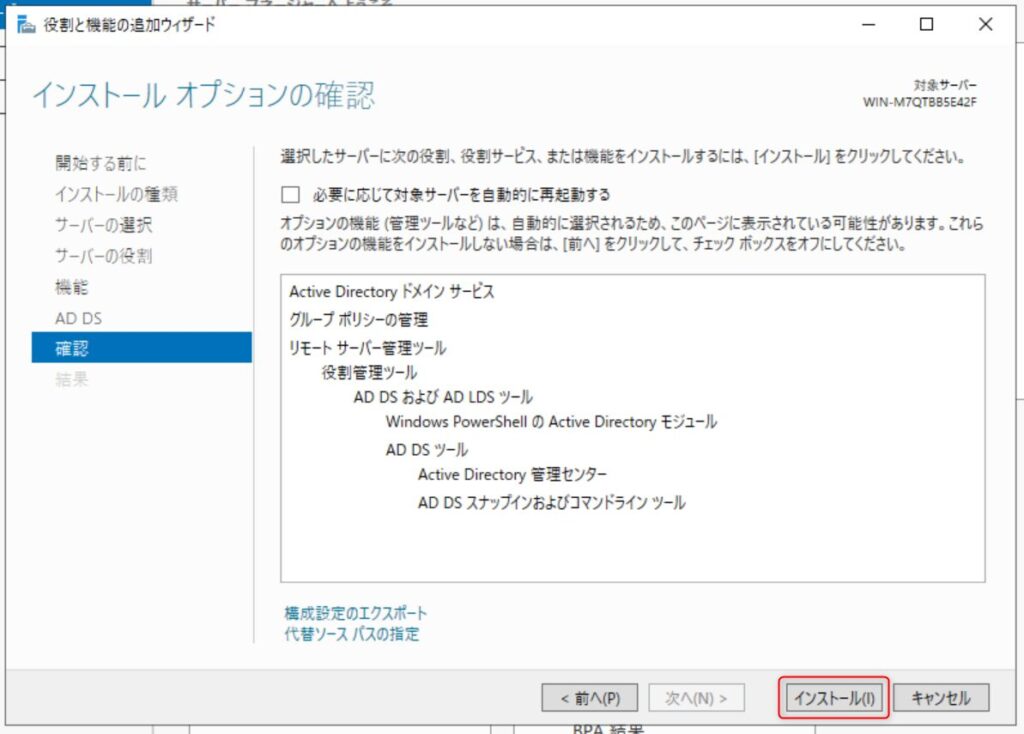 インストールオプションの確認では、特に何もせずに「インストール」をクリック (必要に応じて対象サーバーを自動的に再起動するは、どこかで少々乱暴らしいので、チェックは外した状態にしておく。)