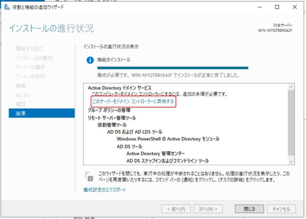 インストールが完了すると、「このサーバをドメインコントローラーに昇格する」リンクが出てくるのでクリック