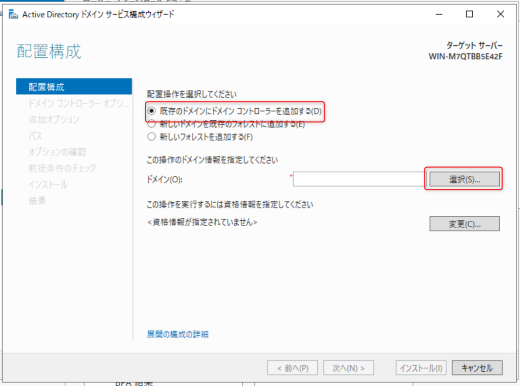 Active Directoryドメインサービス構成ウィザードが表示されるので、配置構成では、「既存のドメインにドメインコントローラーを追加する」を選択し、ドメインの「選択」をクリック