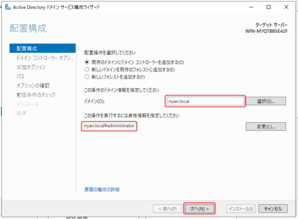 配置構成に戻ってくるので、ドメインや資格情報が表示されていることを確認し「次へ」をクリック