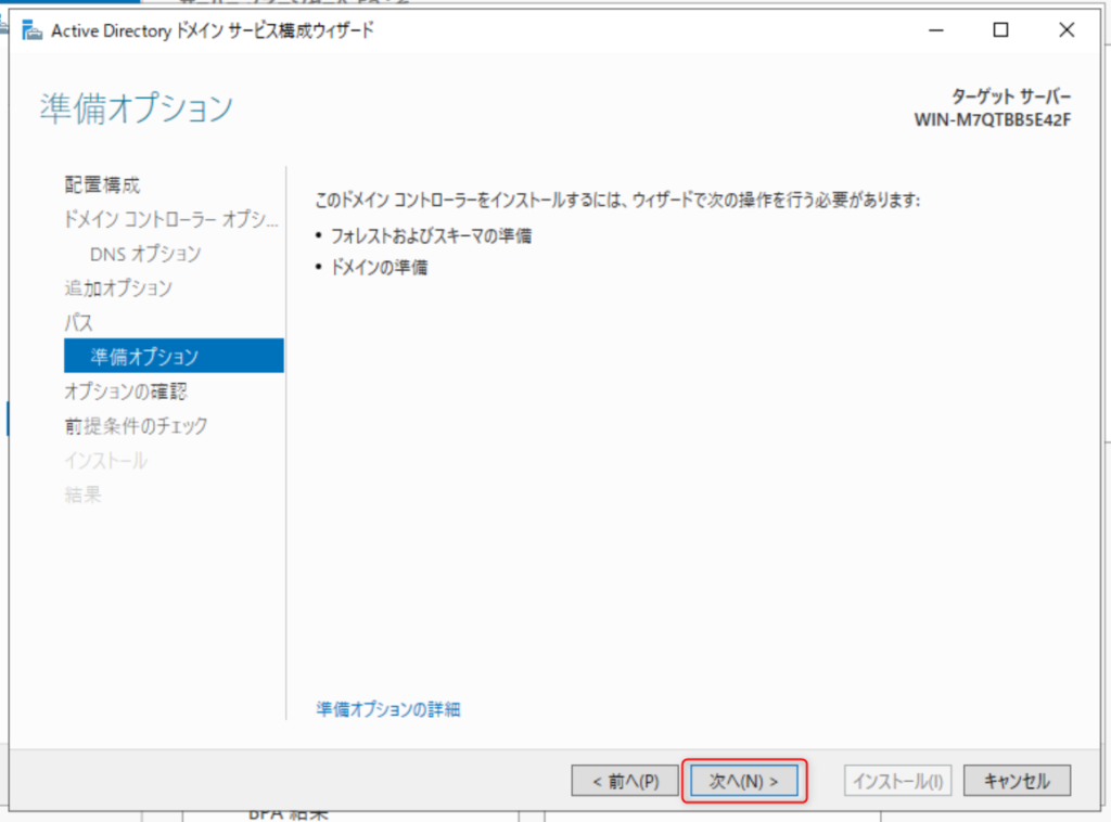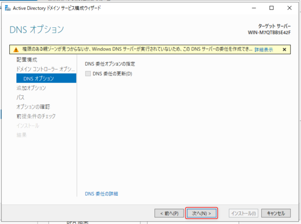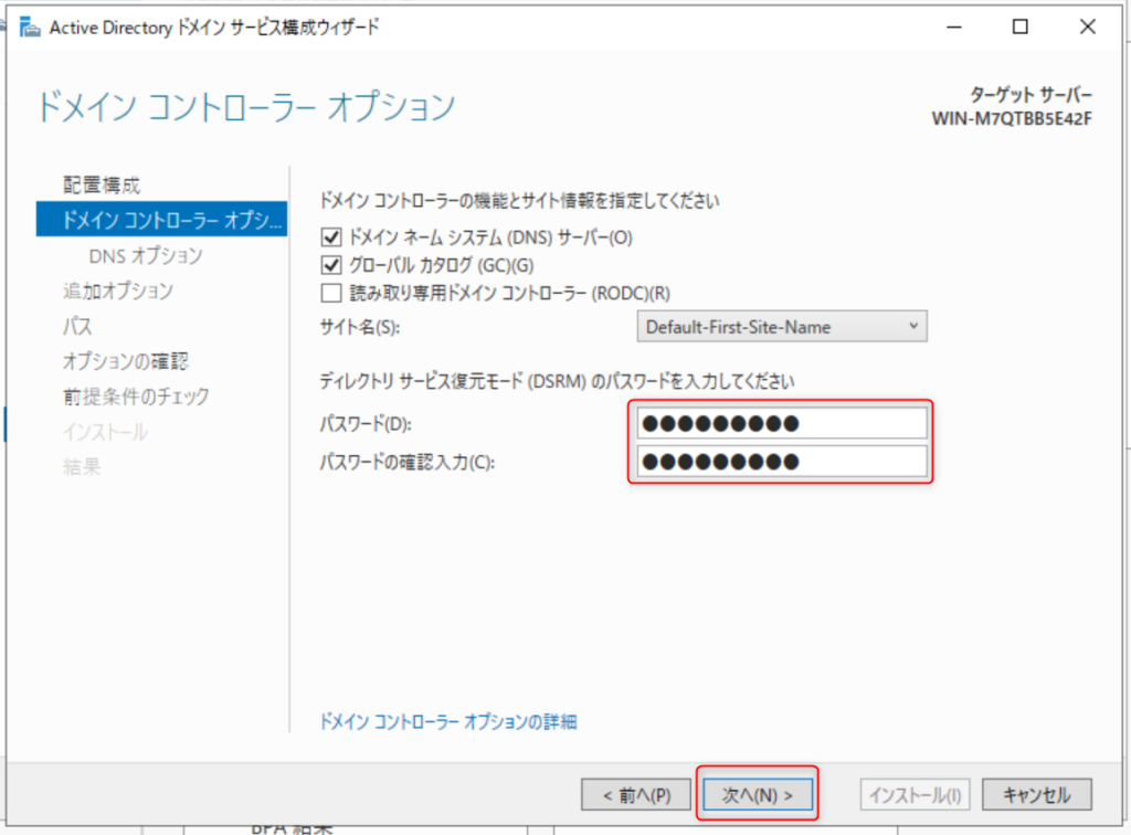 ドメインコントローラーオプションでは、パスワードを入力して「次へ」をクリック
