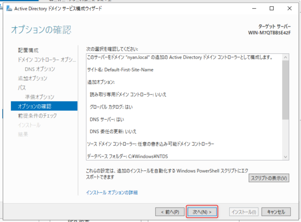 オプションの確認では何もすることはないので、「次へ」をクリック
