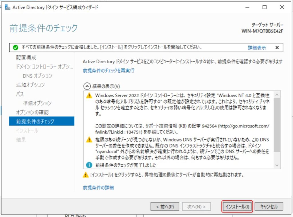 前提条件のチェックでは、とくに何もやることがやいので「インストール」をクリック