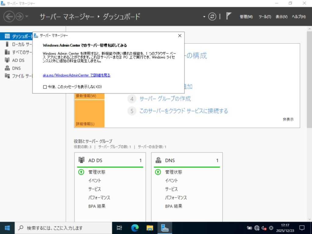 再起動が終わると、ログイン画面になるので、ログインしてみると、サーバーマネージャーが表示されるので、これでインストール完了!